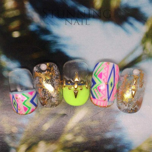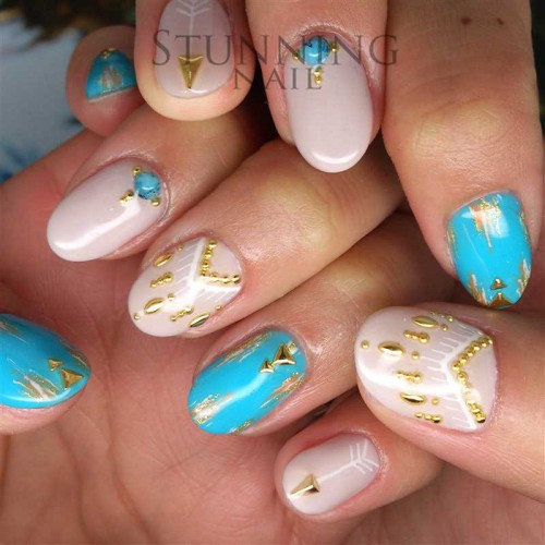 いずみです☆ ターコイズブルーとベージュカラーで夏な民族調ネイルです(^O^) 弓矢もポイント♪ ・ジェル …