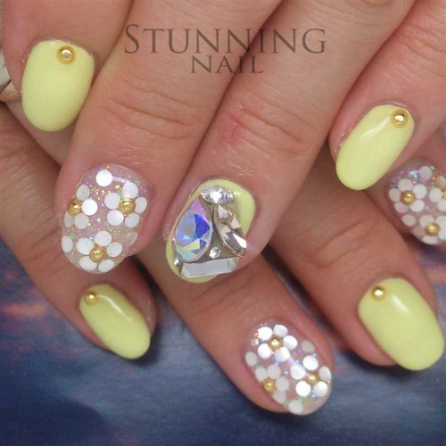 いずみです! 可愛いパステルイエローにホロでお花アート、それだけには止まらずVカットストーンも盛り盛りに♪ ・…
